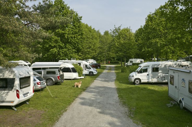 Many white modern campervan recreational motor home vehicles parked in row at camper park site Magdeburg city against Elbe river bridge. Motorhome campground stataion travel destination. RV lifestyle.